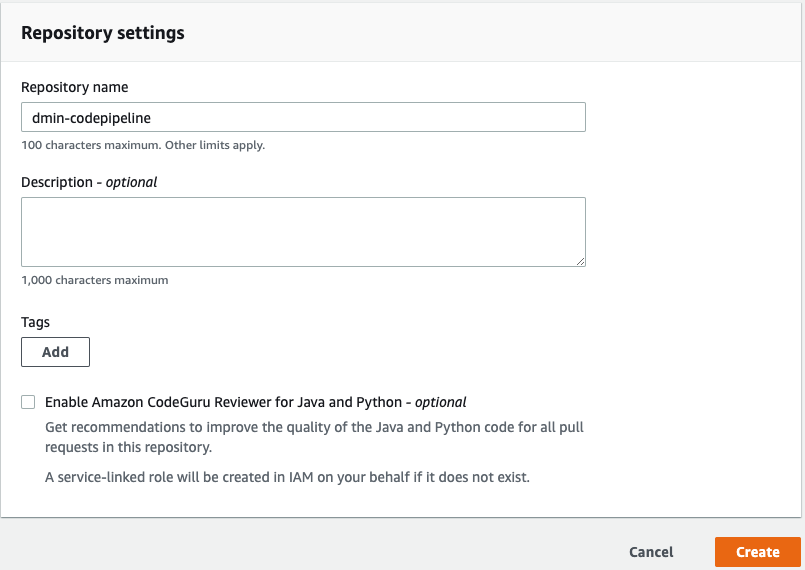 Provide a Repository Name of YOUR_NAME-codepipeline (replacing YOUR_NAME with your name 😀 ) and click Create.