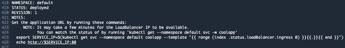 - helm upgrade --install --wait coolapp ./coolapp/ --set accountId=${ACCOUNT_ID} --set prefix=${REPO_PREFIX} --set tag=${COMMIT_HASH} --set service.type=LoadBalancer