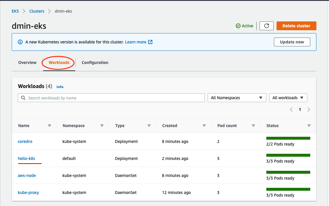 Workloads that are deployed to your EKS cluster are displayed in the AWS Console. Navigate to your EKS cluster and then Workloads.