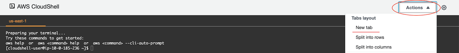 You will do some of the work from the Amazon Cloud Shell, a command line environment running in the Cloud. This virtual machine is loaded with all the development tools you'll need (aws cli, python) and offers a persistent 1GB home directory and runs in AWS, greatly enhancing network performance and authentication. Open the Amazon Cloud Shell by clicking on the icon on the top right of the screen: