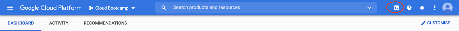 You will do most of the work from the Google Cloud Shell, a command line environment running in the Cloud. This virtual machine is loaded with all the development tools you'll need (docker, gcloud, kubectl and others) and offers a persistent 5GB home directory and runs in Google Cloud, greatly enhancing network performance and authentication. Open the Google Cloud Shell by clicking on the icon on the top right of the screen: