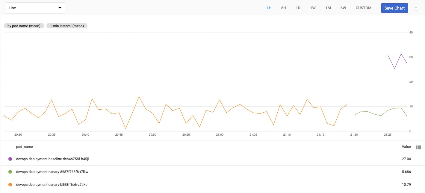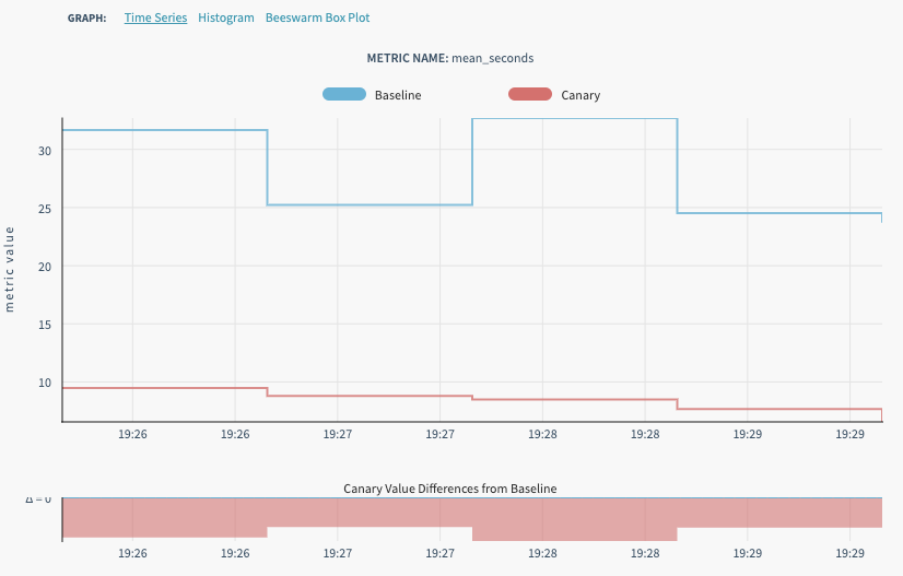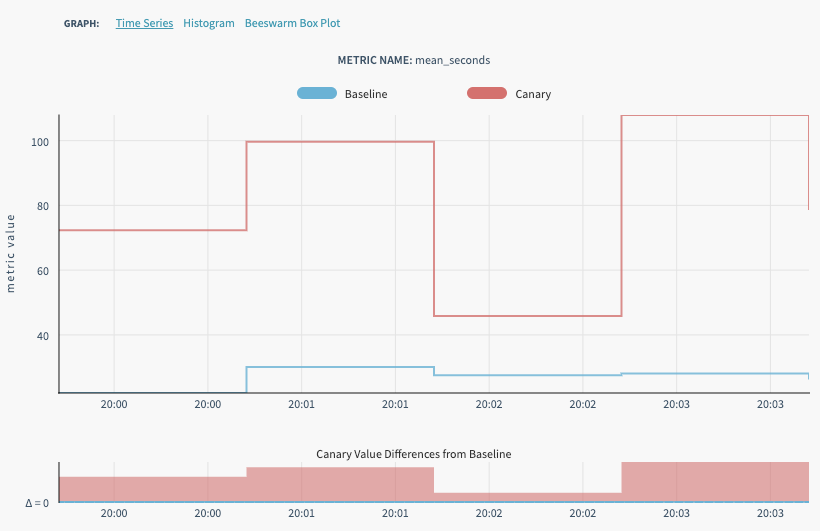 While you're waiting - after baseline is deployed, go to the monitoring tab if you've left it open and verify that both canary and baseline metrics are being collected. You should see that the new canary has worse "performance" than baseline.