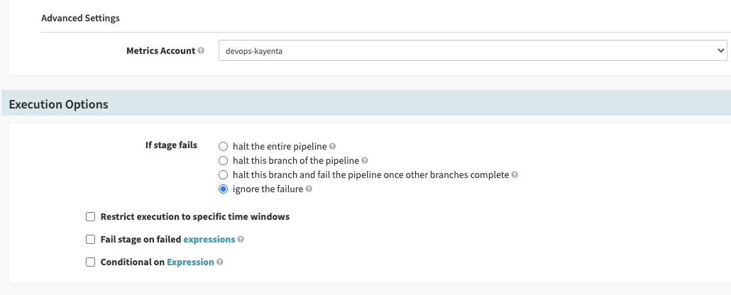Scroll down to Execution Options, and select ignore the failure. This is needed so that the later stages still run, so we can delete the canary.