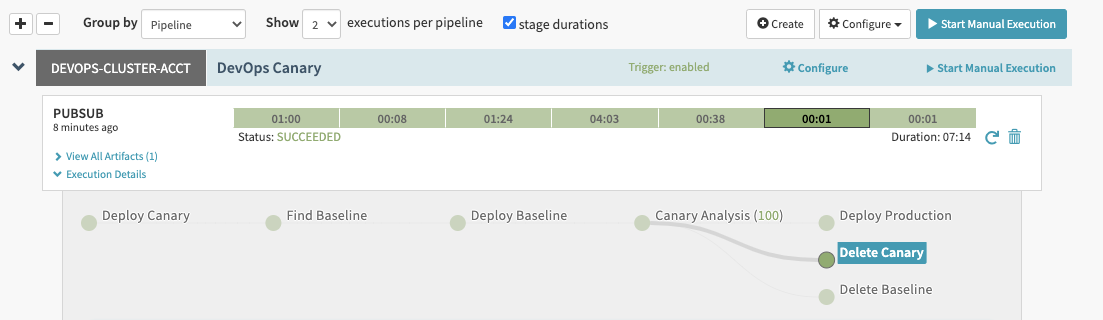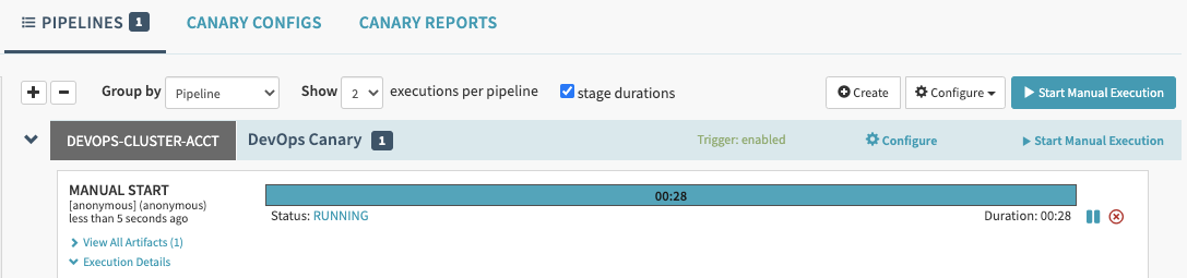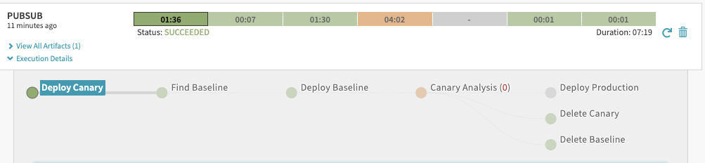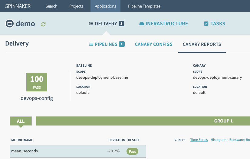 Wait ~ 1 minute for the build to finish and go to Spinnaker's Delivery → Pipelines. Wait till Spinnaker runs the analysis.