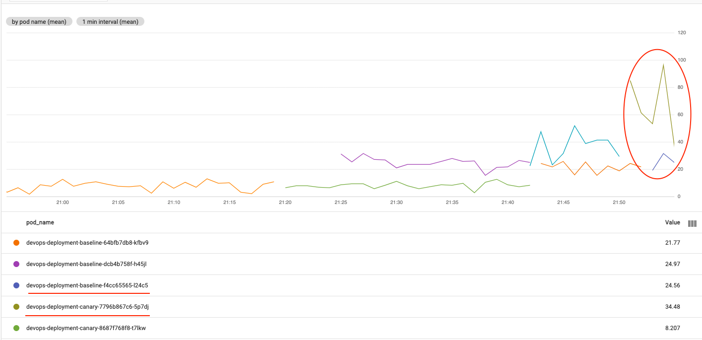 While you're waiting - after baseline is deployed, go to the monitoring tab if you've left it open and verify that both canary and baseline metrics are being collected. You should see our first canary pod and a new one, as well as a baseline pod.