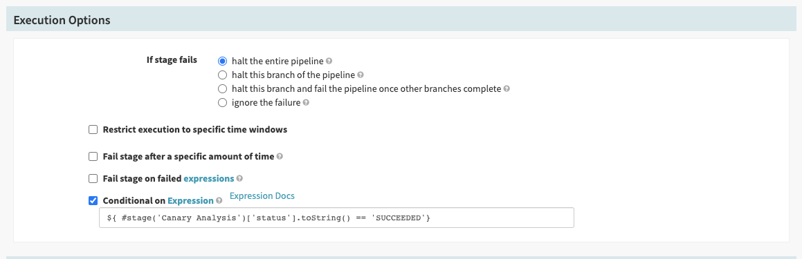 Scroll down to Execution Options and to ensure that you deploy to production only if the canary analysis succeeds (as we ignore canary failures), change the Conditional on Expression parameter to ${ #stage('Canary Analysis')['status'].toString() == 'SUCCEEDED'}